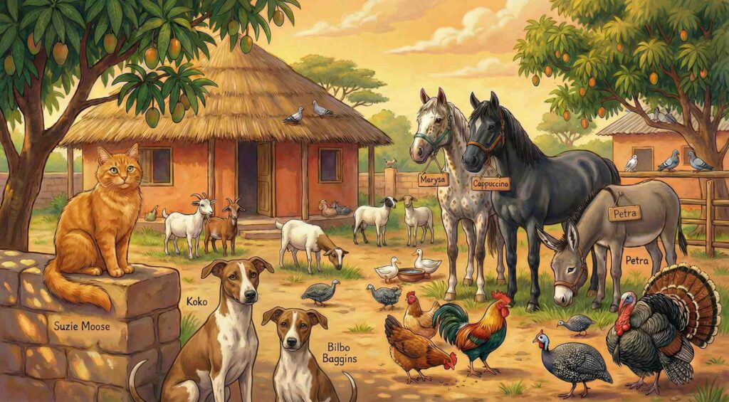 Whether you’re resting on your journey or seeking a deeper connection with village life, Ndungu Kebbe Lodge welcomes you like family. Guests experience a living smallholding where friendly dogs, a ginger cat, turkeys, guinea fowl, pigeons, chickens, sheep, goats, a gentle donkey, and the horses Marysa and Cappuccino roam freely.