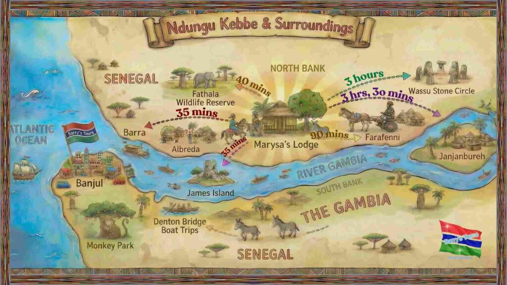 Guests can visit destinations such as Farafenni, Wassu Stone Circles, Janjangbureh, Juffreh, Kunta Kinteh Island, Chimpanzee Island, Fathala Wildlife Reserve, or even Dakar. Whether you stay the night or for a week, Ndungu Kebbe Lodge is an ideal base for exploring the region while enjoying comfort, calm, and connection.