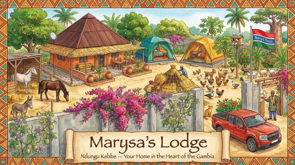 Welcome to Marysa’s Lodge, a beautifully authentic and wonderfully unpretentious retreat on the edge of the bustling market town of Ndungu Kebbe. This is not your average guesthouse—it is a working smallholding very much in progress, brimming with life, colour and the kind of genuine West African countryside experience that most visitors to the Gambia never get to see. Fall asleep to the symphony of cicadas, wake up to the crow of roosters, and watch the sun melt in extraordinary colours over the mango trees each evening. Here, the Gambia reveals itself at its most real and most rewarding.