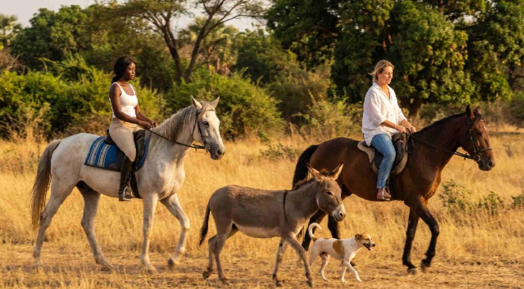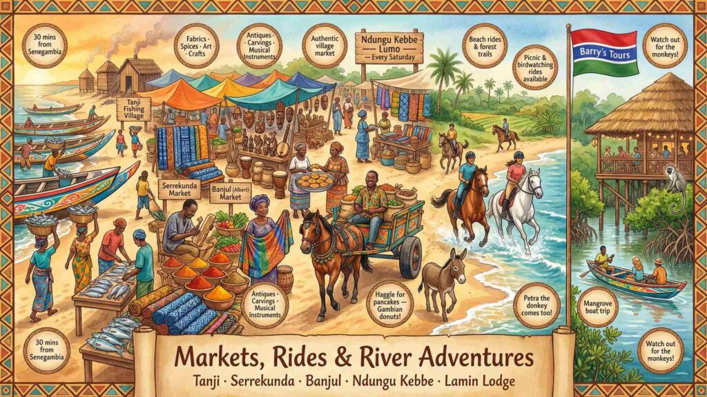 Whether you dream of cantering along a sun-drenched Atlantic beach with the waves lapping at your horse’s hooves, or exploring the lush farmland, forests and lakes of the Gambian countryside, Barry’s Tours can make it happen. Beach rides offer that classic, timeless experience of horse and sea — and on the right day, you can even take a swim with the horses in the shallows. More on that on the Kotu Horses website https://kotuhorses.mozello.co.uk/services/